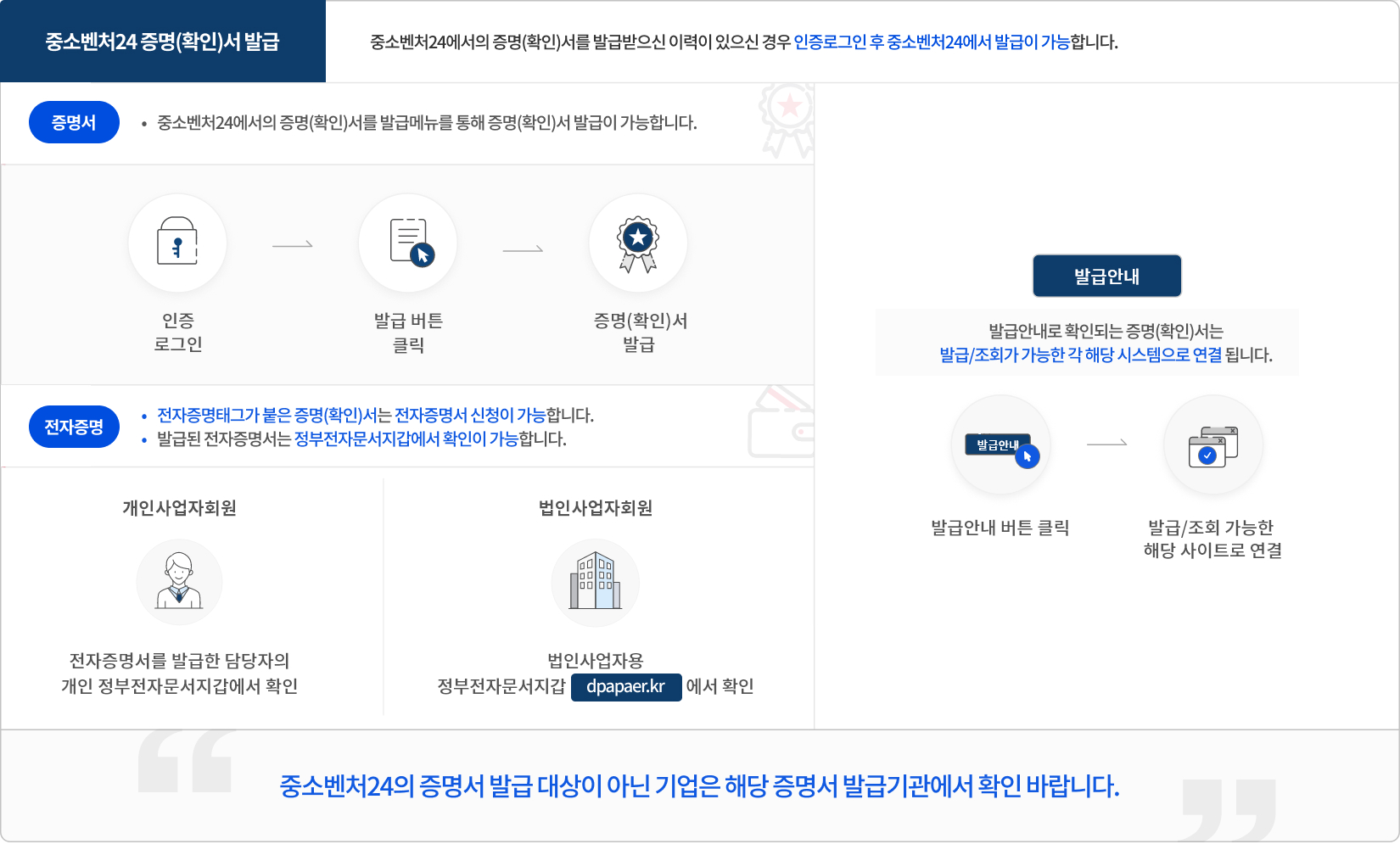 중소벤처24의 증명서 발급 대상이 아닌 기업은 해당 증명서 발급기관에서 확인 바랍니다.번호 | 증명(확인)서 | 발급기관 | 소관기관 | 발급 |