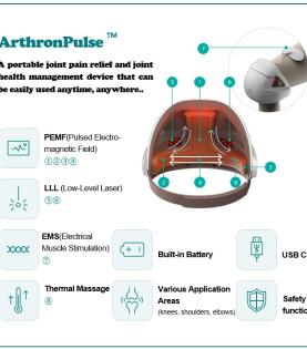 Entwick has developed a new concept of PEMF module in a small size that successfully delivers magnetic fields to deep tissues of knee or joints with low power consumption. With the patented PEMF module, Entwick developed ArthronPulseTM , which is the world first portable and personal arthritis treatment device of providing total treatments of PEMF, LLL, EMS and heat therapy.